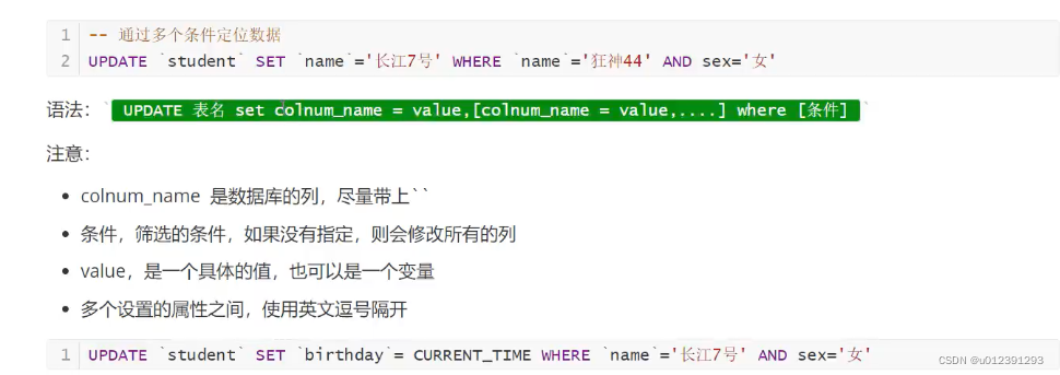 -- UPDATE 表名 SET colnum_name=value,colnum_name=value[colnum_name=value……] WHERE [条件];