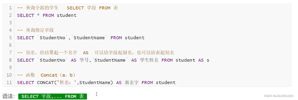 SELECT CONCAT(字段名1,字段名2,...)FROM table