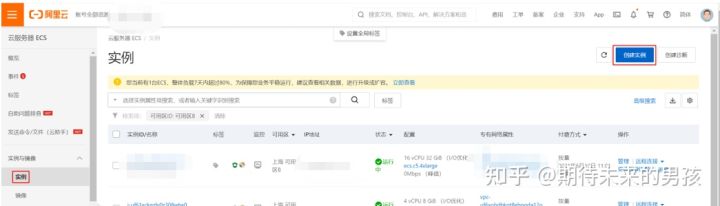 1 登录“阿里云控制台”→“云服务器ECS” →“实例”→“创建实例”