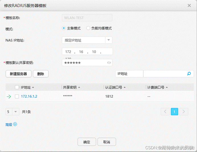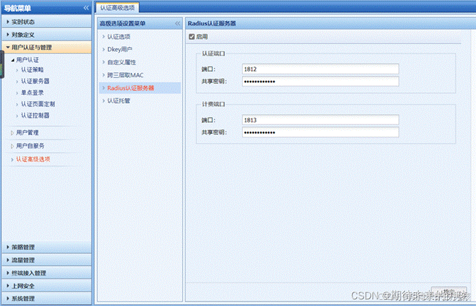 如下图,点击【用户认证管理-认证高级选项-Radius服务器】,填写radius端口和对应的密钥 (对应着华为的radius配置)