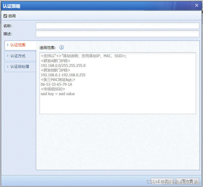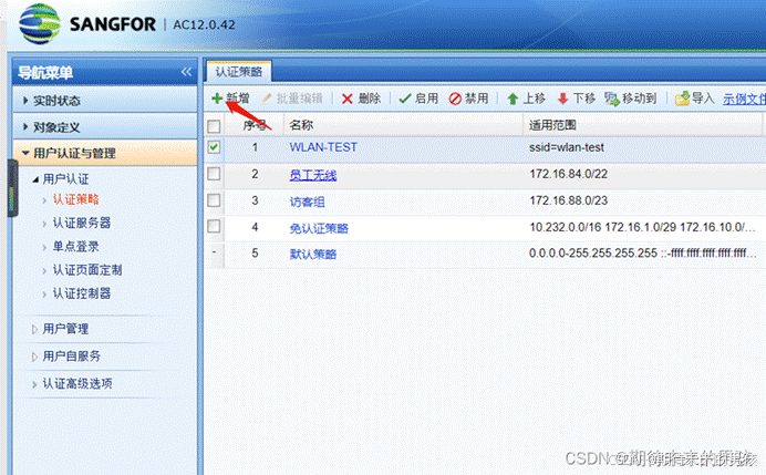 2、【新增】-【认证策略】,建议在测试初级,针对于单个地址来进程测试,测试成功之后, 逐步扩大测试范围