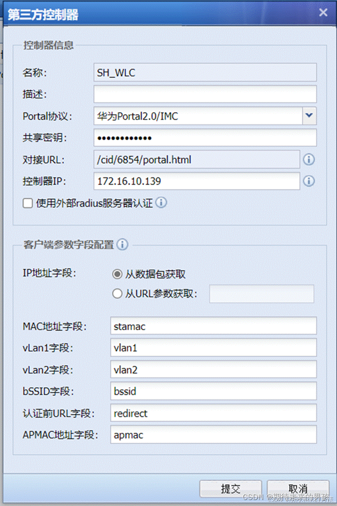 如下图,点击【用户认证管理-用户认证-portal服务器】,新增portal控制器,选择对应的协议(这 里选择华为),填写WAC的IP(172.16.10.139),客户端字段保持与华为设置一致,这个参数是与AC 做portal对接的设备上面的参数,一般是把认证数据重定向到ACportal服务器上的参数。这个参数需 要AC和对接设备上面的一模一样。