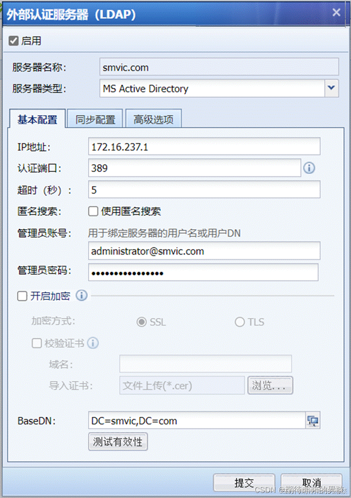 3、测试有效性【测试有效性】输入AD测试账号信息测试是否有效