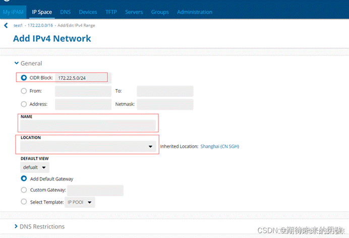 进入BAM——点击IP Space——点击IPv4——点击已创建的IPv4 Blocks内——点击Blocks and Networks(编辑 )——选着IPv4 Network——输入 CIDR Block,NAME,LOCATION,等信息——最后点击ADD