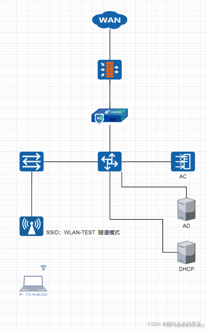 拓扑中含AD域控制器、DHCP服务器、上网行为管理、无线控制器、无线接入点、测试终端、测试账号等。