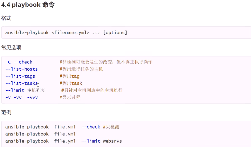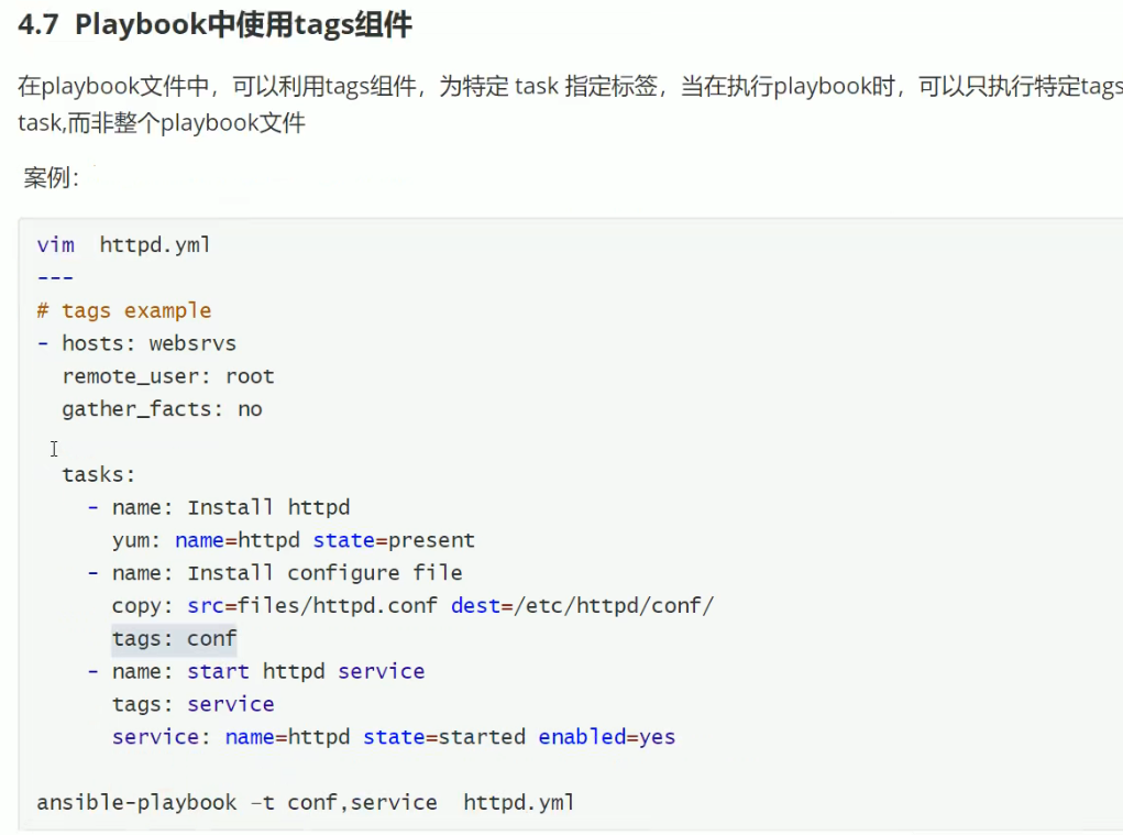 ansible-playbook –t install,conf httpd.yml 指定执行install,conf 两个标签