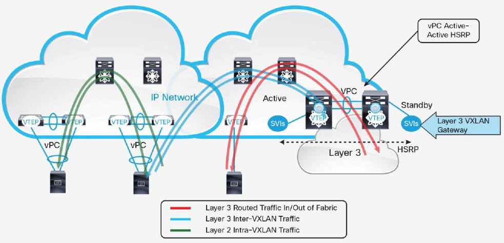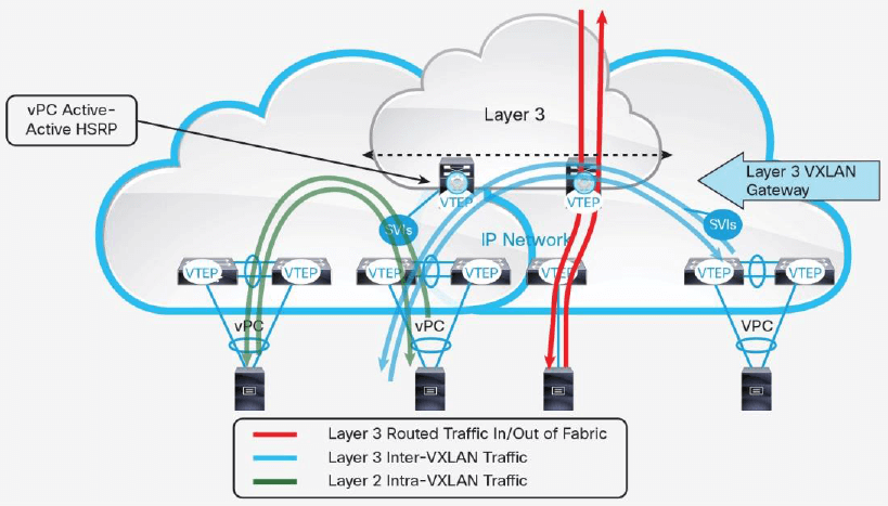 FabricPath 脊叶网络相同的泛洪挑战。第 3 层路由功能位于第 2 层网络之上。常见的第 3 层设计使用集中路