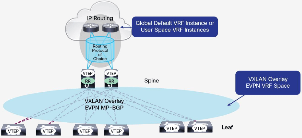 VXLAN MP-BGP EVPN 支-叶架构使用第 3 层 IP 作为底层网络。