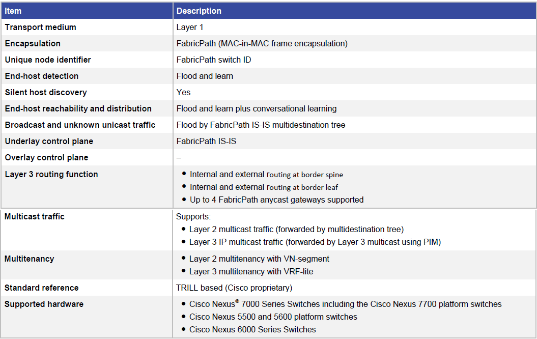 Fabric®Path spine-and-leaf 网络是 Cisco 的专利,但基于 TRILL 标准。它使用 Fabric®Path MAC-in-MAC 帧封装。