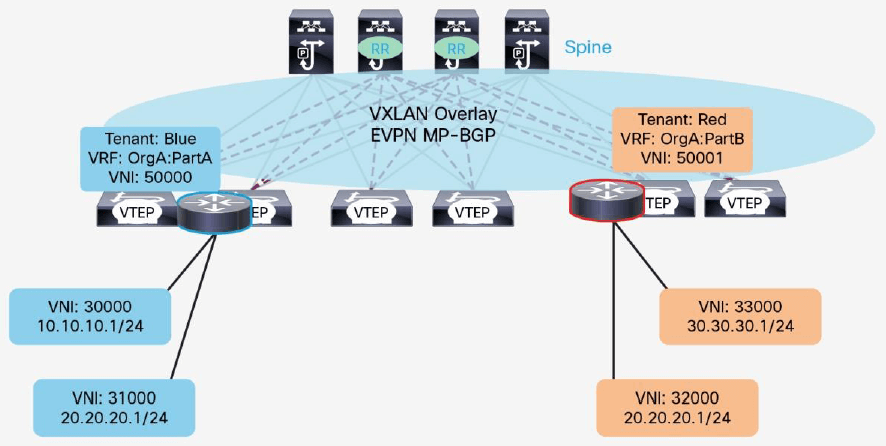 图 19 Cisco VXLAN MP-BGP EVPN Spine-and-Leaf 网络的多租户