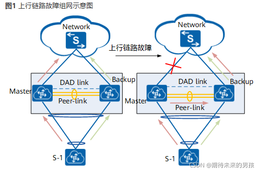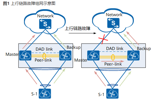 如图1所示,M-LAG接入普通以太网场景,由于M-LAG主设备的上行链路故障,通过M-LAG主设备的流量均经过peer-link链路进行转发。