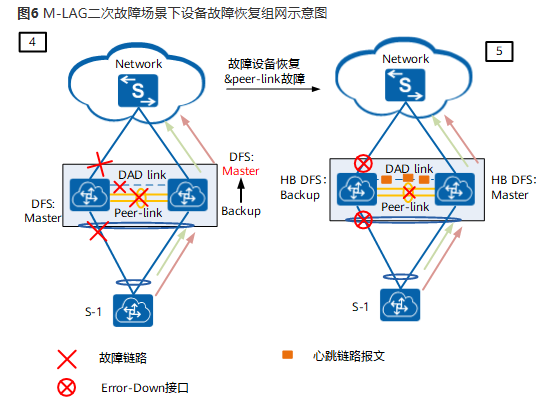 如图5中2所示,在M-LAG应用于双归接入时,当peer-link故障但双主检测心跳状态正常会触发DFS备设备上某些端口处于Error-Down状态,此时DFS状态为主的设备继续工作。在该场景的基础上,若DFS状态为主的设备由于断电、主控板损坏、整机故障重启等其他故障导致主设备不能工作时,由图5中3所示,此时M-LAG主备设备皆不能正常转发流量。