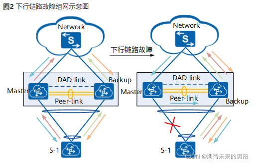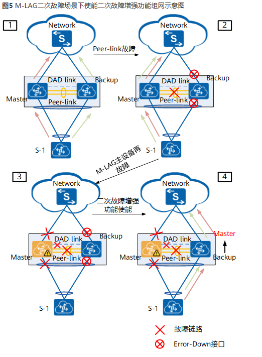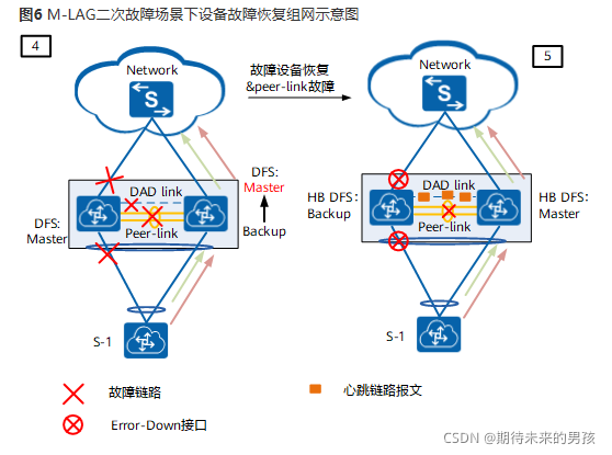 在该场景下,可以借助M-LAG二次故障增强功能来实现该故障场景下业务不中断的可靠性要求,如图5所示,通过M-LAG二次故障增强功能来说明不同的故障阶段和产生的行为:
