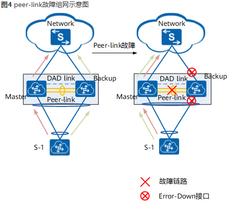 缺省情况下,M-LAG应用在普通以太网络、VXLAN网络或IP网络的双归接入,peer-link故障但双主检测心跳状态正常时,会触发M-LAG备设备上除逻辑端口、管理网口、peer-link接口和堆叠口以外的其他接口处于Error-Down状态。M-LAG应用在TRILL网络的双归接入,peer-link故障但双主检测心跳状态正常时,会触发M-LAG备设备上的M-LAG接口处于Error-Down状态。