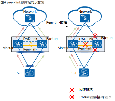 M-LAG作为一种跨设备链路聚合的技术,把链路可靠性从单板级提高到了设备级。如果出现故障(不管是链路故障、设备故障还是peer-link故障),M-LAG都能够保证正常的业务不受影响,下面介绍M-LAG在故障情况下是如何保障业务的正常运行的。