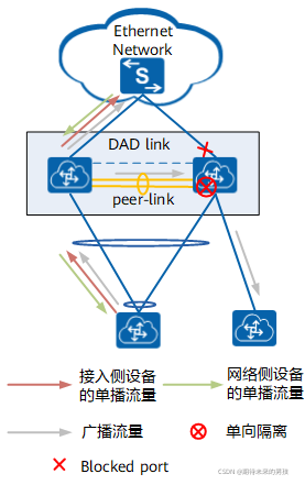 M-LAG本身具有防环机制,可以构造出一个无环网络。那么M-LAG是如何构造无环网络的呢?如图1所示,从接入设备或网络侧到达M-LAG配对设备的单播流量,会优先从本地转发出去,peer-link链路一般情况下不用来转发数据流量。当流量通过peer-link链路广播到对端M-LAG设备,在peer-link链路与M-LAG成员口之间设置单方向的流量隔离,即从peer-link口进来的流量不会再从M-LAG口转发出去,所以不会形成环路,这就是M-LAG单向隔离机制。