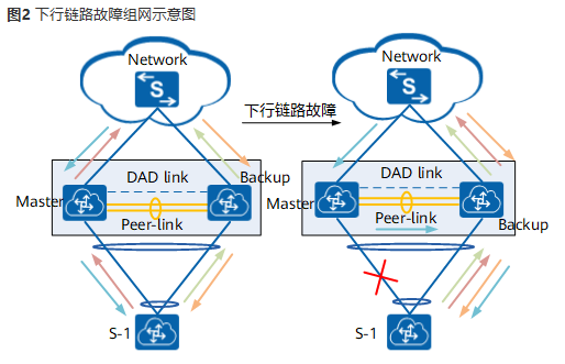当下行M-LAG成员口故障时,DFS Group主备状态不会变化,但如果故障M-LAG成员口状态为主,则备M-LAG成员口状态由备升主,流量切换到该链路上进行转发。发生故障的M-LAG成员口所在的链路状态变为Down,双归场景变为单归场景。故障M-LAG成员口的MAC地址指向peer-link接口。在故障M-LAG成员口恢复后,M-LAG成员口状态不再回切,由备升主的M-LAG成员口状态仍为主,原主M-LAG成员口在故障恢复后状态为备。可以执行display dfs-group dfs-group-id node node-id m-lag命令来查看成员接口当前状态。