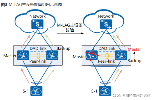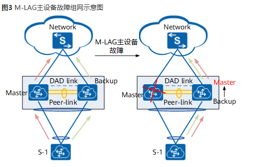 M-LAG主设备故障,M-LAG备设备将升级为主,其设备侧Eth-Trunk链路状态仍为Up,流量转发状态不变,继续转发流量。M-LAG主设备侧Eth-Trunk链路状态变为Down,双归场景变为单归场景。