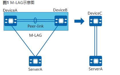 M-LAG(Multichassis Link Aggregation Group)即跨设备链路聚合组。如图1所示,M-LAG是将ServerA(可以是设备或主机)与另外两台设备DeviceA和DeviceB进行跨设备链路聚合,如同ServerA和一台设备建立了链路聚合关系,从而把链路可靠性从单板级提高到了设备级。