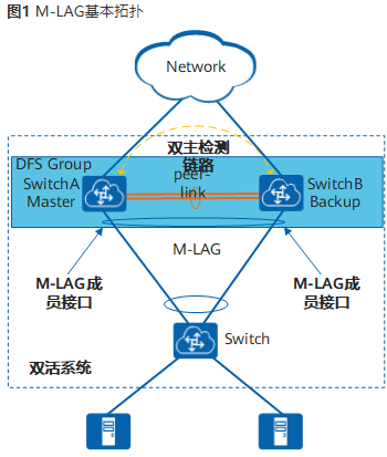 | 双主检测链路 | 双主检测链路,又称为心跳链路,是一条三层互通链路,用于M-LAG主备设备间发送双主检测报文。 |