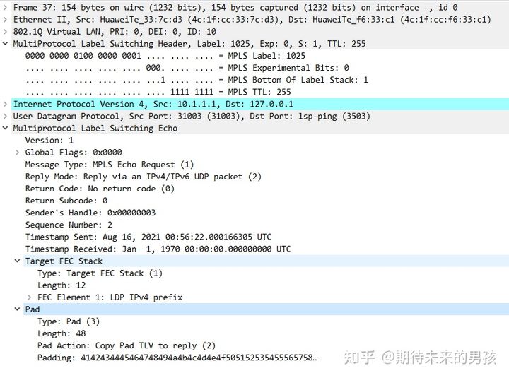 IP报文进入MPLS网络时,MPLS入口的LER分析IP报文的内容并且为这些IP报文添加合适的标签,所有MPLS网络中的LSR根据标签转发数据。当该IP报文离开MPLS网络时,标签由出口LER弹出。