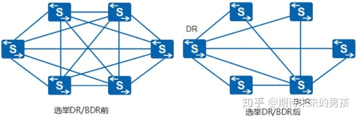 为了防止DR发生故障,重新选举DR时会产成业务中断,除了DR之外,还会选举一个备份指定路由器BDR。这样除DR和BDR之外的路由器(称为DR Other)之间将不再建立邻接关系,也不再交换任何路由信息,这样就减少了广播网和NBMA网络上各路由器之间邻接关系的数量。