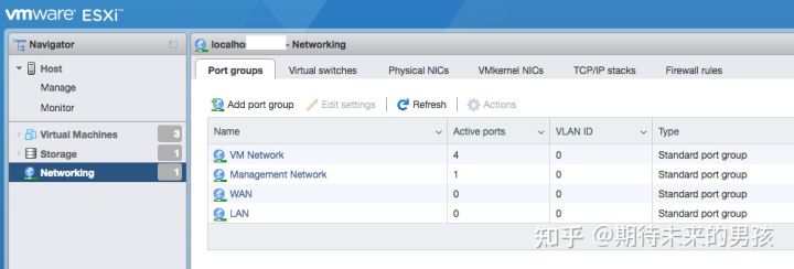 创建端口组 创建虚拟交换机后,单击端口组选项卡。在端口组选项卡上单击“添加端口组”。添加 WAN 和 LAN 端口组,每个组分别使用 WAN 和 LAN 交换机。