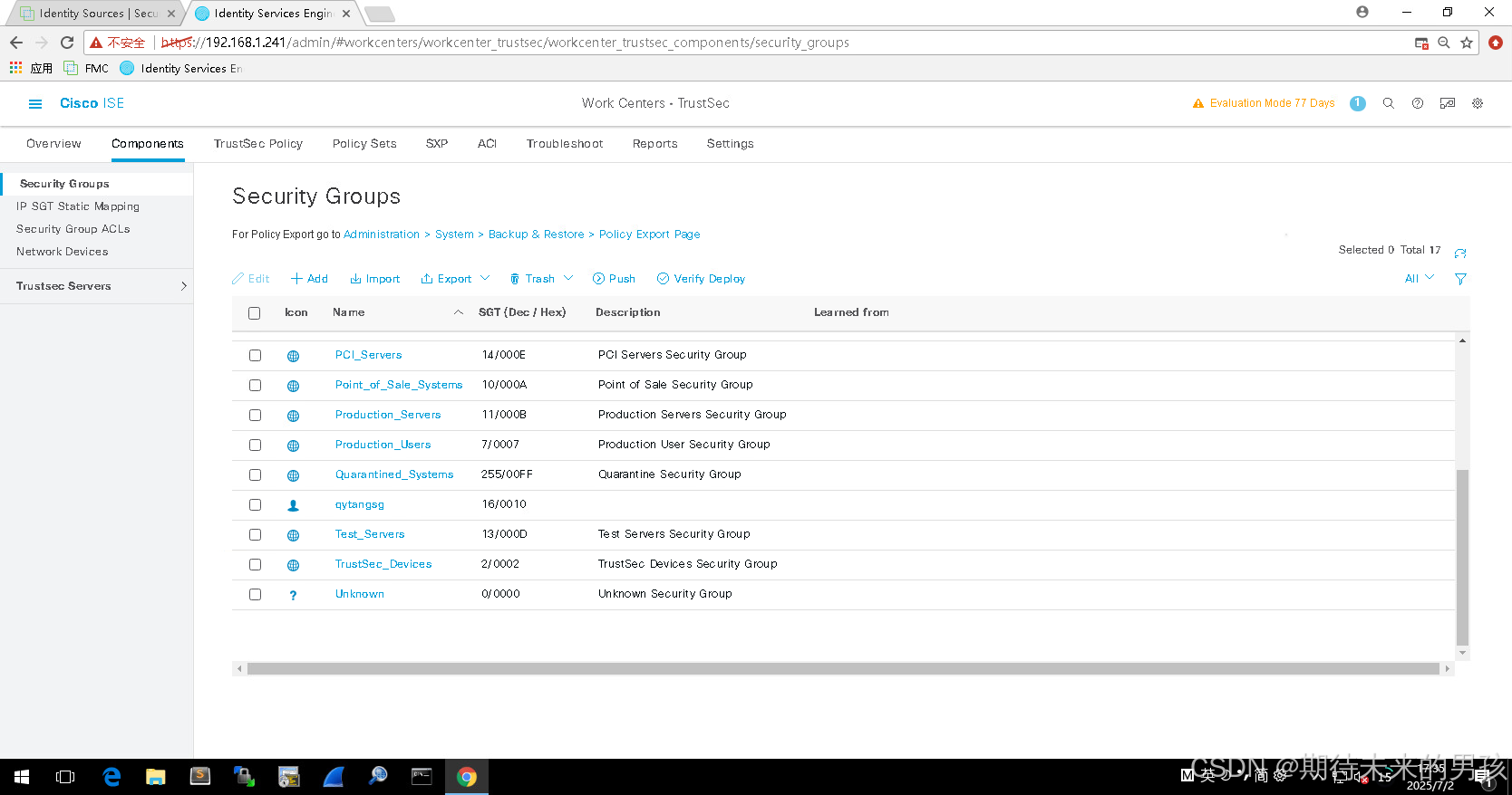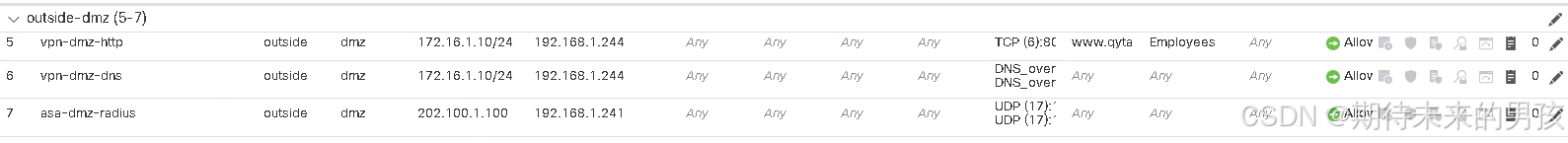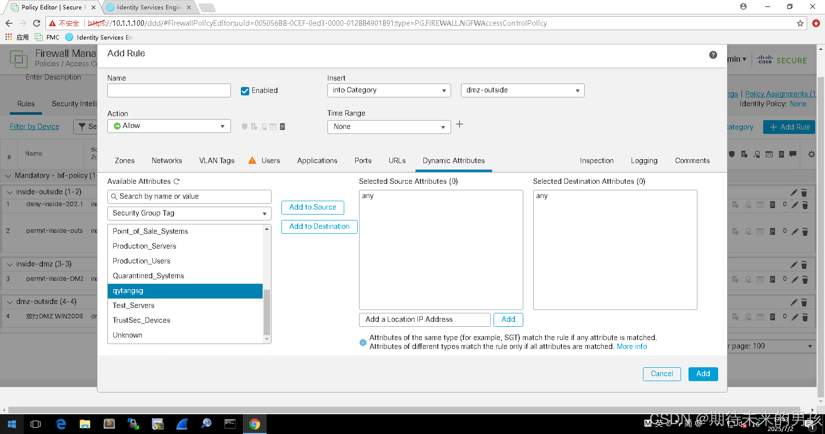 PxGrid总结 1.FMC同步时间与集成域,下载用户 2.ISE与AD域集成,提取域用户组 3.ISE与FMC的PxGrid联动(两个证书+Approval) 4.ASAVPN通过ISE认证授权 5. ISE授权VPN用户SGT(Employee) Tag 6.ISE通过PxGrid分享(EndPointProfileMetada、SessionDirectory 和TrustsecMetaData)到FMC上 7.FMC通过SGT(Employee)Tag控制穿越防火墙的流量 放行ISE 到FMC 流量