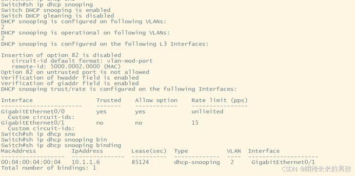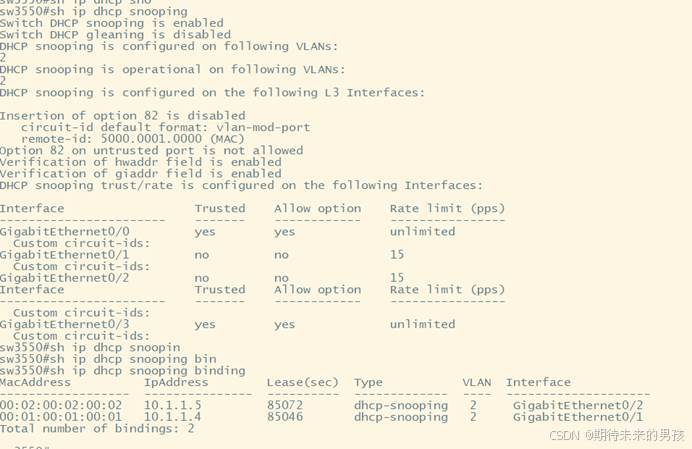 - 限制其他非信任端口DHCP请求速率为15,并在VLAN2启用DHCP Snooping;