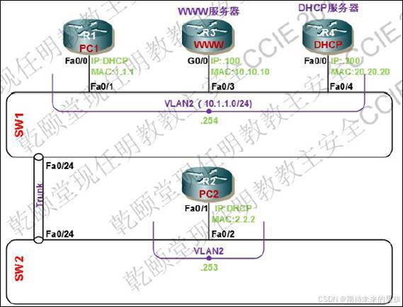 参照以上拓扑,配置物理实验台拓扑(ISE实验台),完成一下DHCP Snooping实验: