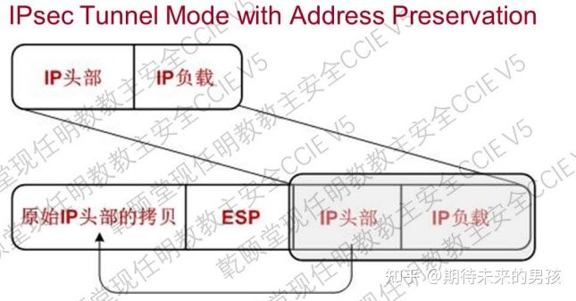传统意义上的IPSEC,隧道端点的地址被作为新的IP包的源和目的。数据包使用加密端的物理接口地址作为源地址,使用解密端的物理接口地址作为目的地址在IP网络上进行路由(隧道模式)。在GET VPN解决方案中,IPSEC保护的数据包将原数据包中的源地址和目的地址复制一份作为整个IP包头中的地址。