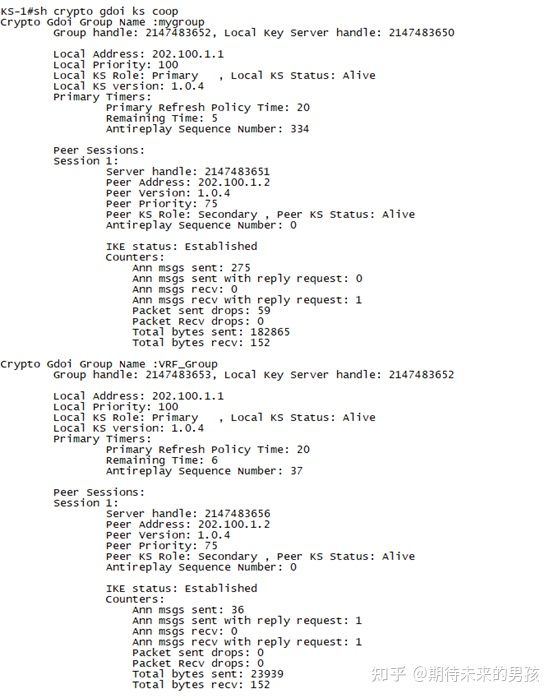 KS在整个GET VPN中扮演着最重要的角色,KS维护着整个GET VPN的控制层面。因此,仅有一台KS时有可能会在VPN网络中造成单点故障。GET VPN支持多个KS服务器,称之为COOP KSs,用来确保如果主KS失效或者不可达的时侯,GET VPN的控制层面可以使主KS失效时无缝切换到其他的KS。
