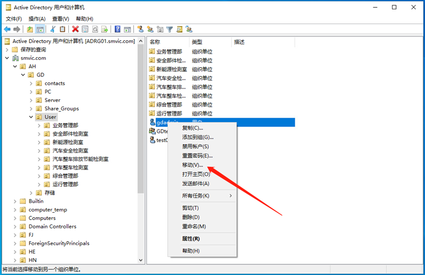 @echo off dsquery computer -anme GD* OU=computer_temp,DC=test,dc=com >> GD.txt for/f %%i in(GD.txt) do dsmove %%i -newparent OU=PC,OU=GD,OU=AH,DC=test,DC=com >> GDNUll.txt