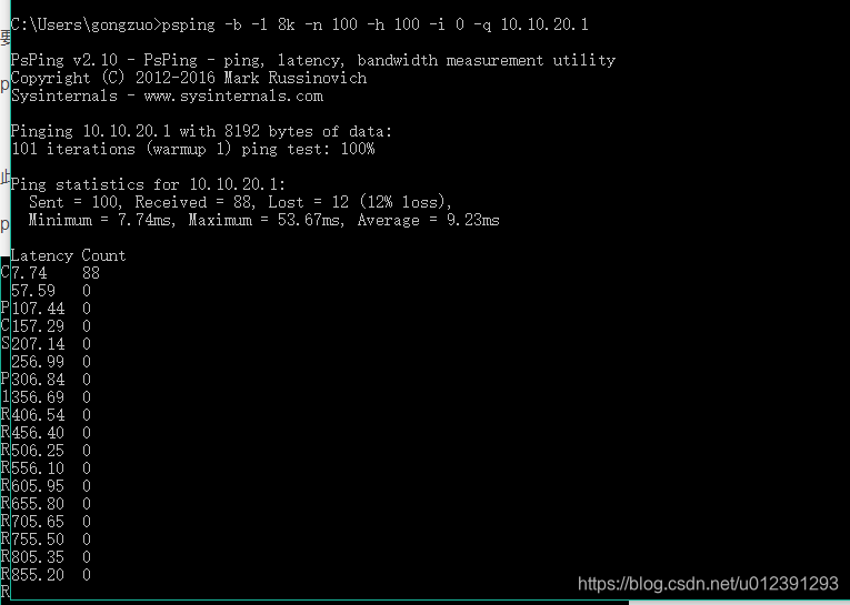 此命令测试 PsPing 服务器在目标 IP 地址上侦听 10 秒的带宽,并生成包含 100 个存储桶的直方图。请注意,测试必须在预热后运行至少一秒钟才能生成直方图。只需添加 -u 即可让 PsPing 执行 UDP 带宽测试。