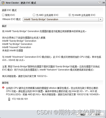 出现这种问题时,我们建议您检查集群中服务器是否都是同一代CPU架构,如果集群中服务器都是同一代CPU架构,在这种情况下EVC特性是不起作用的,建议您关闭集群的EVC特性,对使用上没有任何影响。