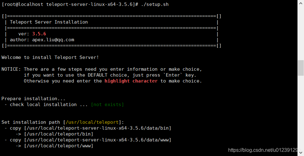 4)安装时需要指定安装路径,您可以使用默认的安装路径/usr/local/teleport(直接回车即可),也可以指定别的路径,请注意路径中不要含有中文字符或空格,以避免出现不可预知的错误。默认的录像回放文件位于/usr/local/teleport/data/replay目录下,会占用/usr的空间