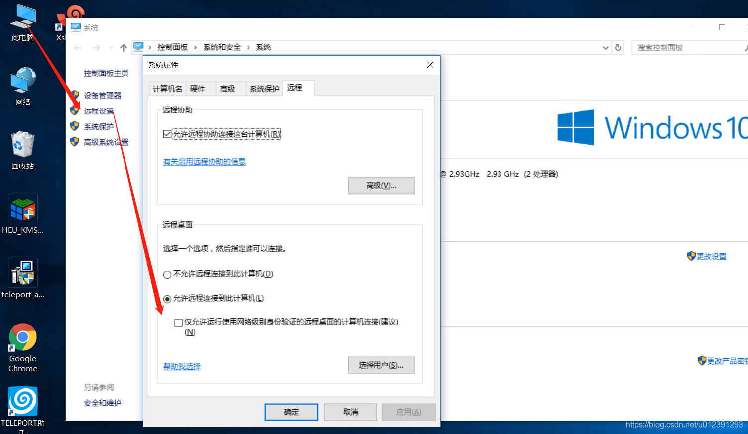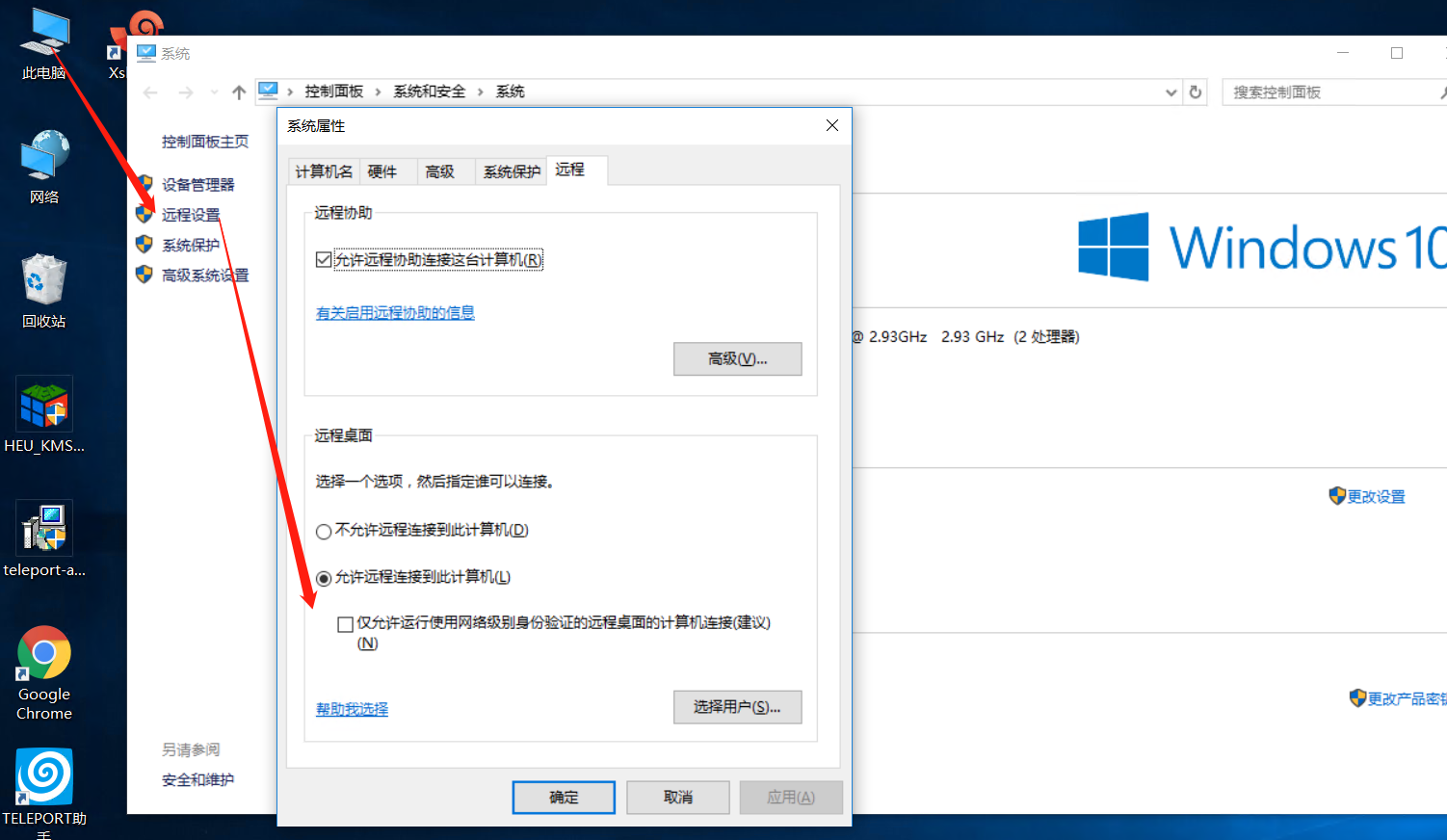 (计算机>>属性>>远程设置>>打开允许远程连接功能,关闭NLA)