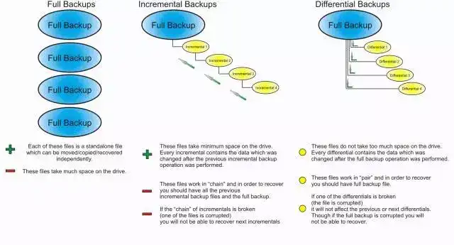 差异备份是累积的—— 一个档案只要自上次完整备份后,曾被更新过,那么接下来每次做差异备份时,这个档案都会被备份。这表示差异备份中的档案,都是自上次完全备份之后,曾被改变的档案。如果要复原整个系统,那么您只要先复原完全备份,再复原最后一次的差异备份即可。增量备份是针对于上一次备份(无论是哪种备份):备份上一次备份后,所有发生变化的文件。所以,差异备份的大小,会随着时间过去而不断增加(假设在完全备份间,每天修改的档案都不一样)。以备份空间与速度来说,差异备份介于增量备份与完全备份之间;但不管是复原一个档案或是整个系统,速度通常比完全备份、增量备份快(因为要搜寻/复原的磁盘数目比较少)。基于这些特点,差异备份是值得考虑的方案,增量备份与差异备份技术也是目前所有企业级备份软件的必备功能。